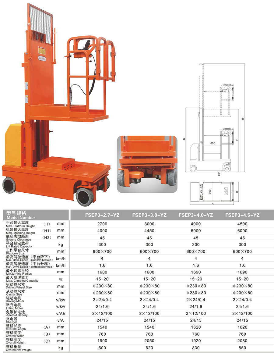 自行走設計,底盤上裝有驅動裝置,操作人員站在工作平臺上自行控制行走、轉向。平臺升高到高處行走時,地面的傾斜度不超過1度。不得在斜坡上進行行走。
